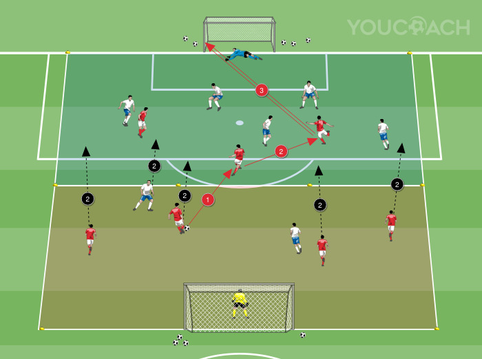 Profondità - Partita a tema con ripartenze, transizioni veloci, rapide verticalizzazioni per attacco porta avversaria -