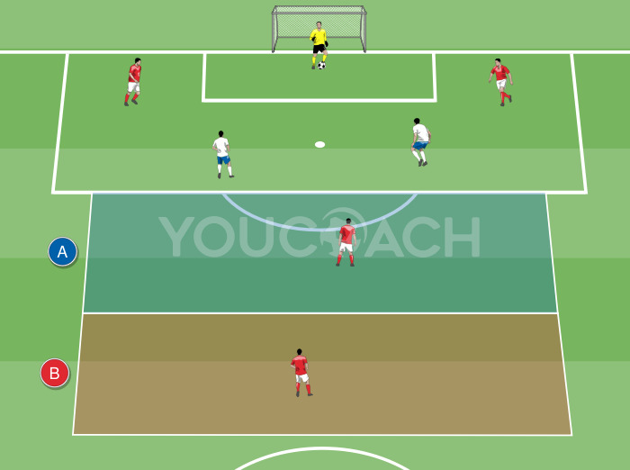 Inserimento di una seconda linea - Allenare il mantenimento del possesso palla con l'ausilio del portiere, le transizioni e l'inserimento in area delle seconde linee -